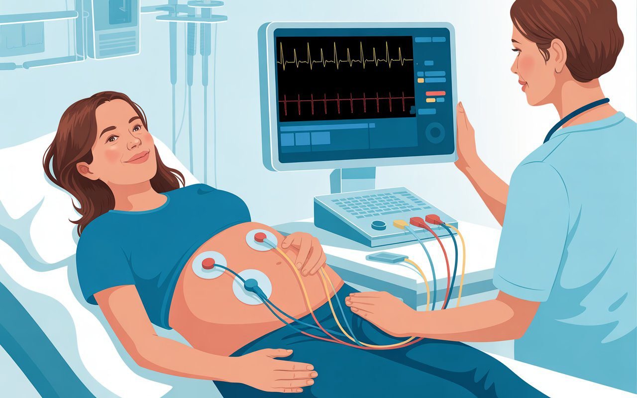 The ECG process is simple and usually very quick. The pregnant woman lies on an exam bed or sits in a semi reclined position. The technician places small adhesive electrodes on the chest and sometimes on the arms and legs. These electrodes have soft pads that rest gently on the skin. They are connected to the ECG machine by thin wires. Once everything is attached, the machine records the heart’s electrical activity for a few seconds.